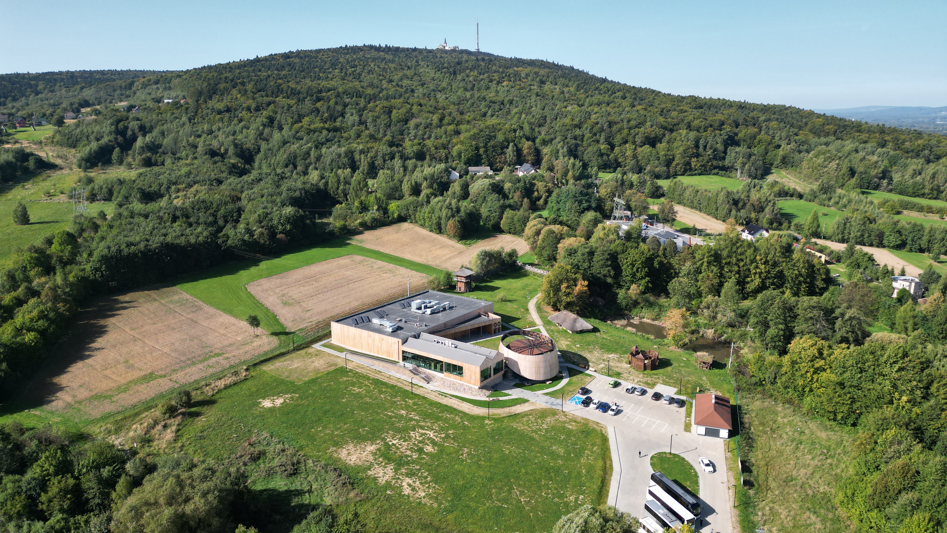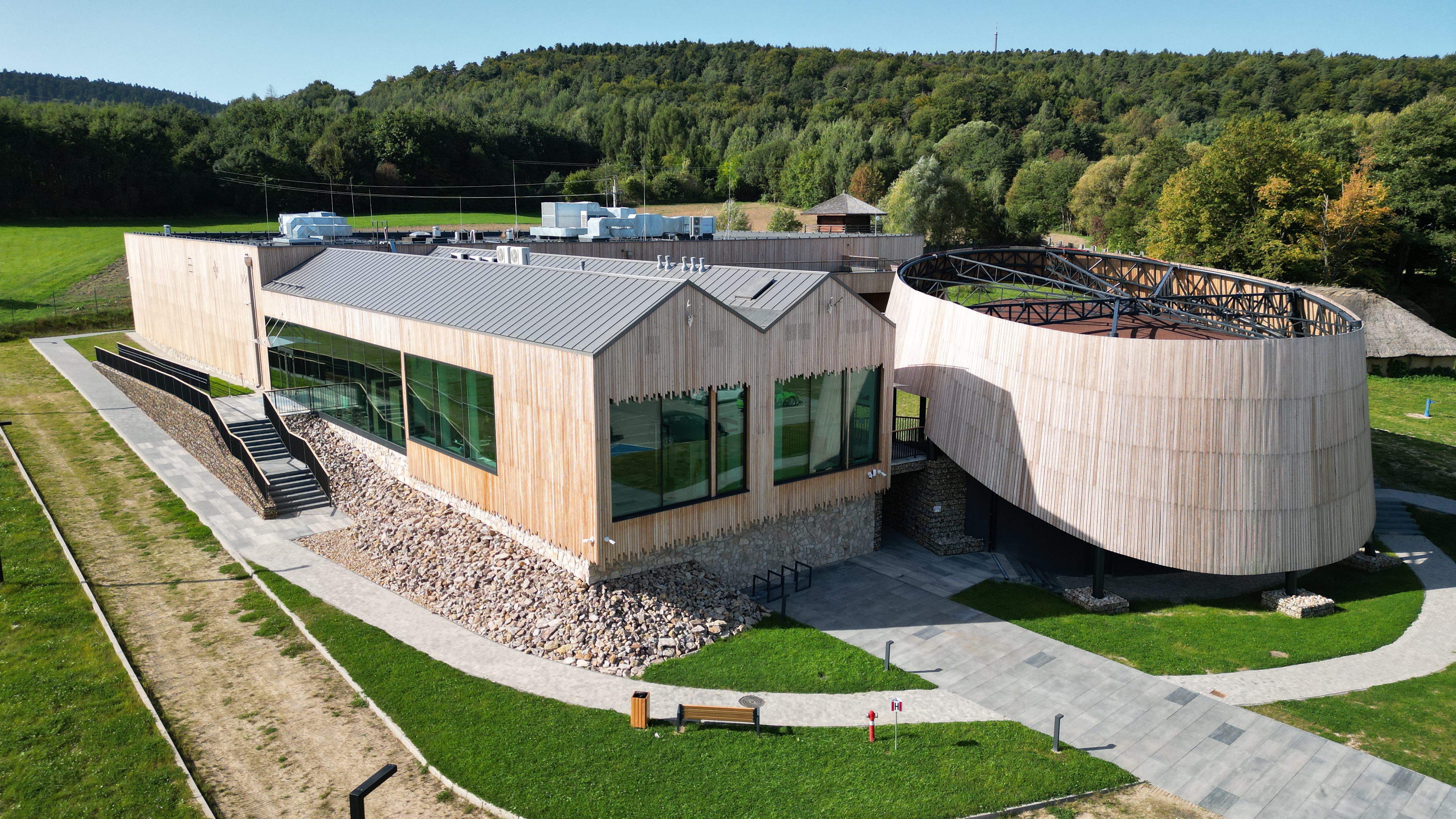 – Naszą intencją było osadzenie go w realiach legend, ale też realiach krajobrazu, tradycji i lokalnej kultury. Dlatego zewnętrzna elewacja została obłożona drewnem, aby jak najlepiej wtapiać się w lokalny krajobraz pobliskiej otuliny Świętokrzyskiego Parku Narodowego. Geometria dachu nawiązuje do zabytkowych, wiejskich chałup oraz stodół i jest tylko delikatnie uzupełniona jest modernistycznymi przeszkleniami i stalą, tworząc współczesny detal architektonicznym. Obiekt ten zaprojektowano tak, aby był maksymalnie przyjazny dla środowiska. Budynek jest ogrzewany przy pomocy pomp ciepła, a energię elektryczną pozyskuje z paneli fotowoltaicznych – dodaje dyrektor Małgorzata Wilk -Grzywna .